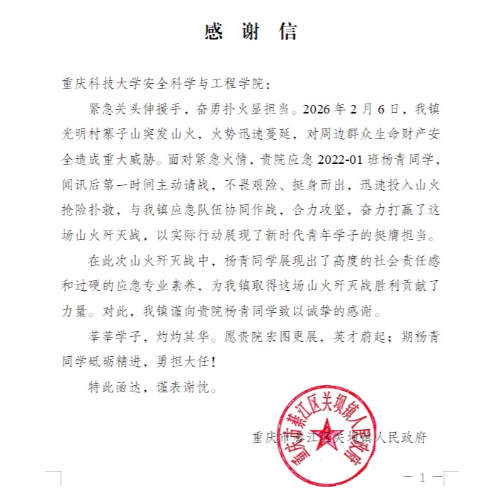 关坝镇人民政府在感谢信中写道:“杨青同学展现出了高度的社会责任感和过硬的应急专业素养。”杨青同学在危急关头挺身而出,展现了新时代重科学子应有的担当与使命,用行动守护了绿水青山,谱写了一曲敢为人先,勇救山火的青春赞歌。